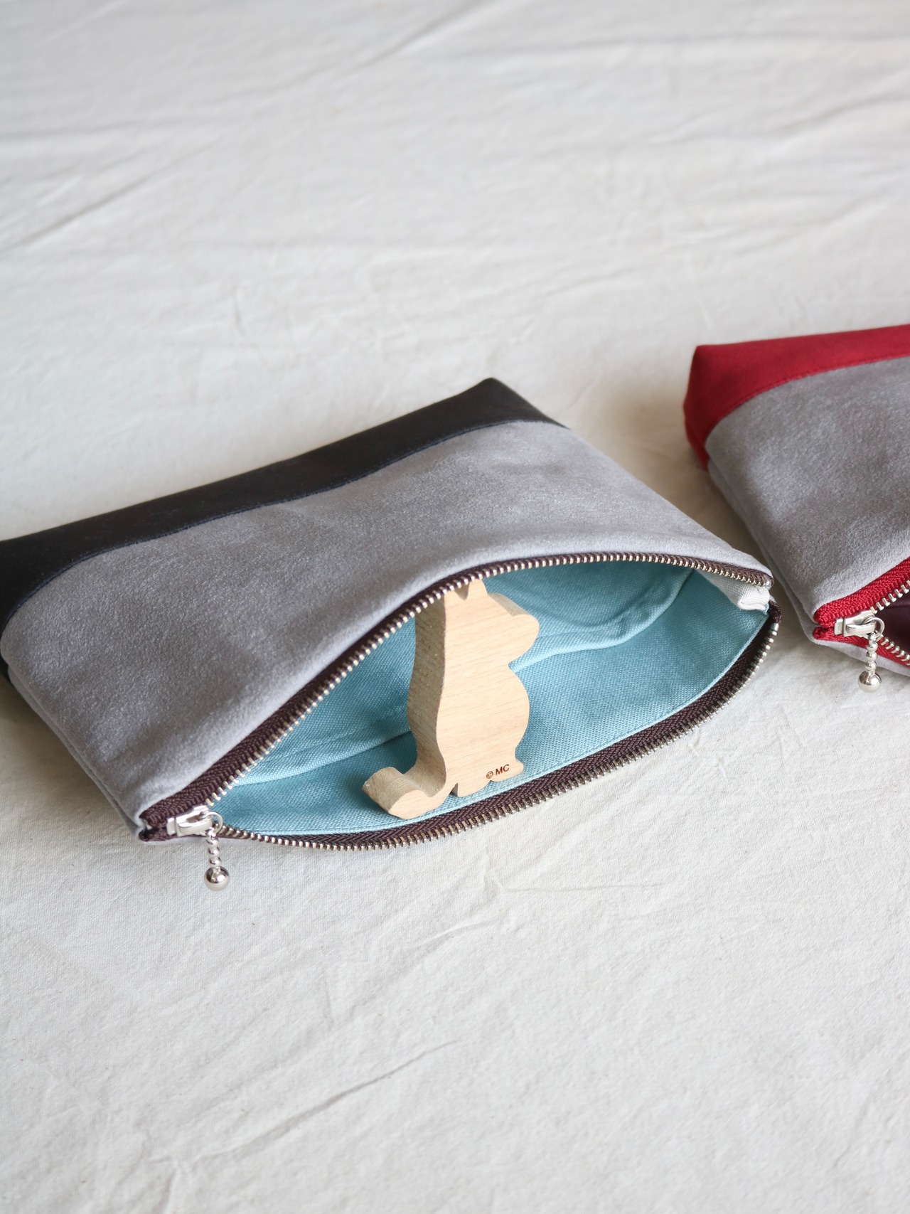 ライトグレー×ビターブラウンのバイカラー仕切りポーチ