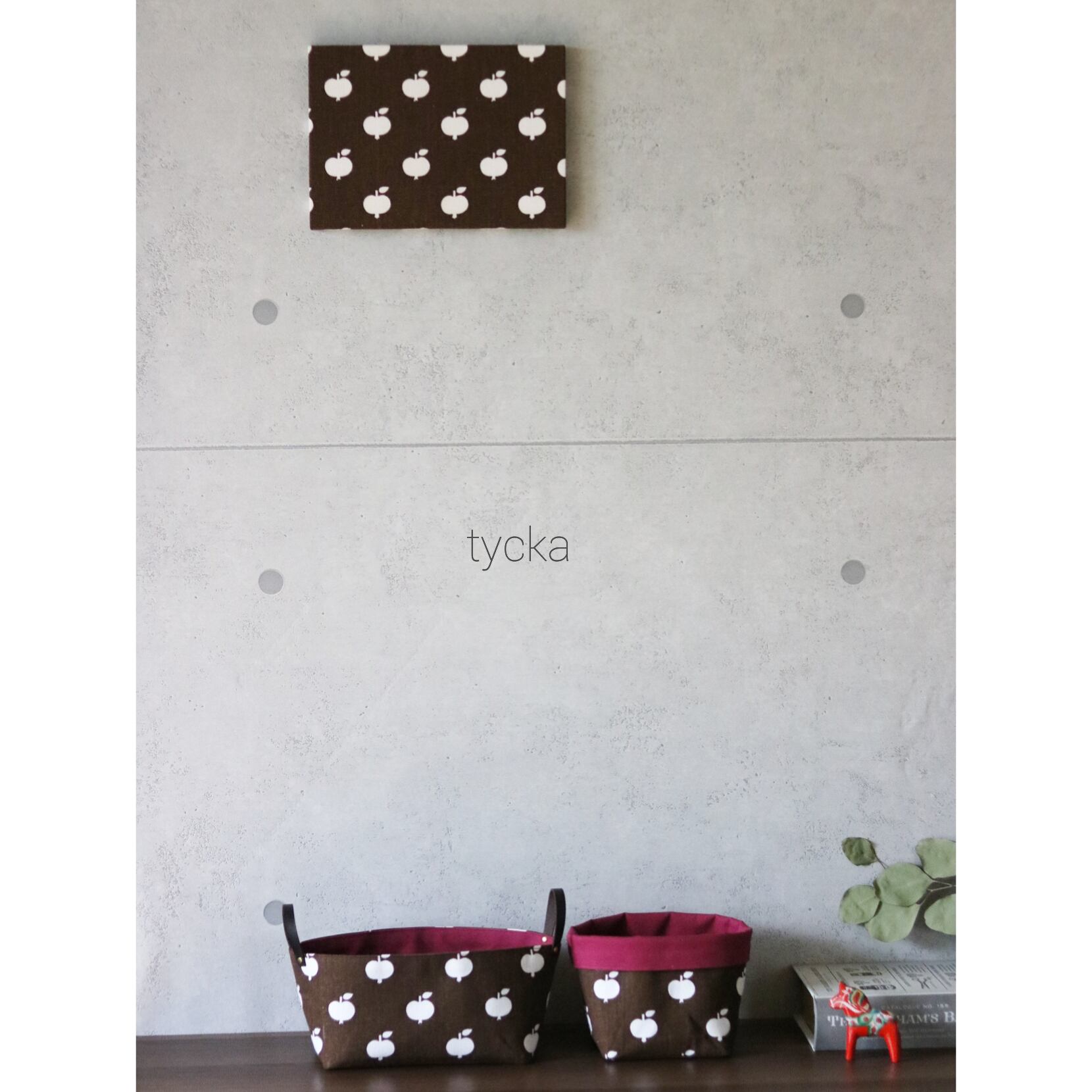 ヴィンテージファンにも人気のブラウン地に、北欧らしいデザインのりんご柄が配置されたファブリックです。