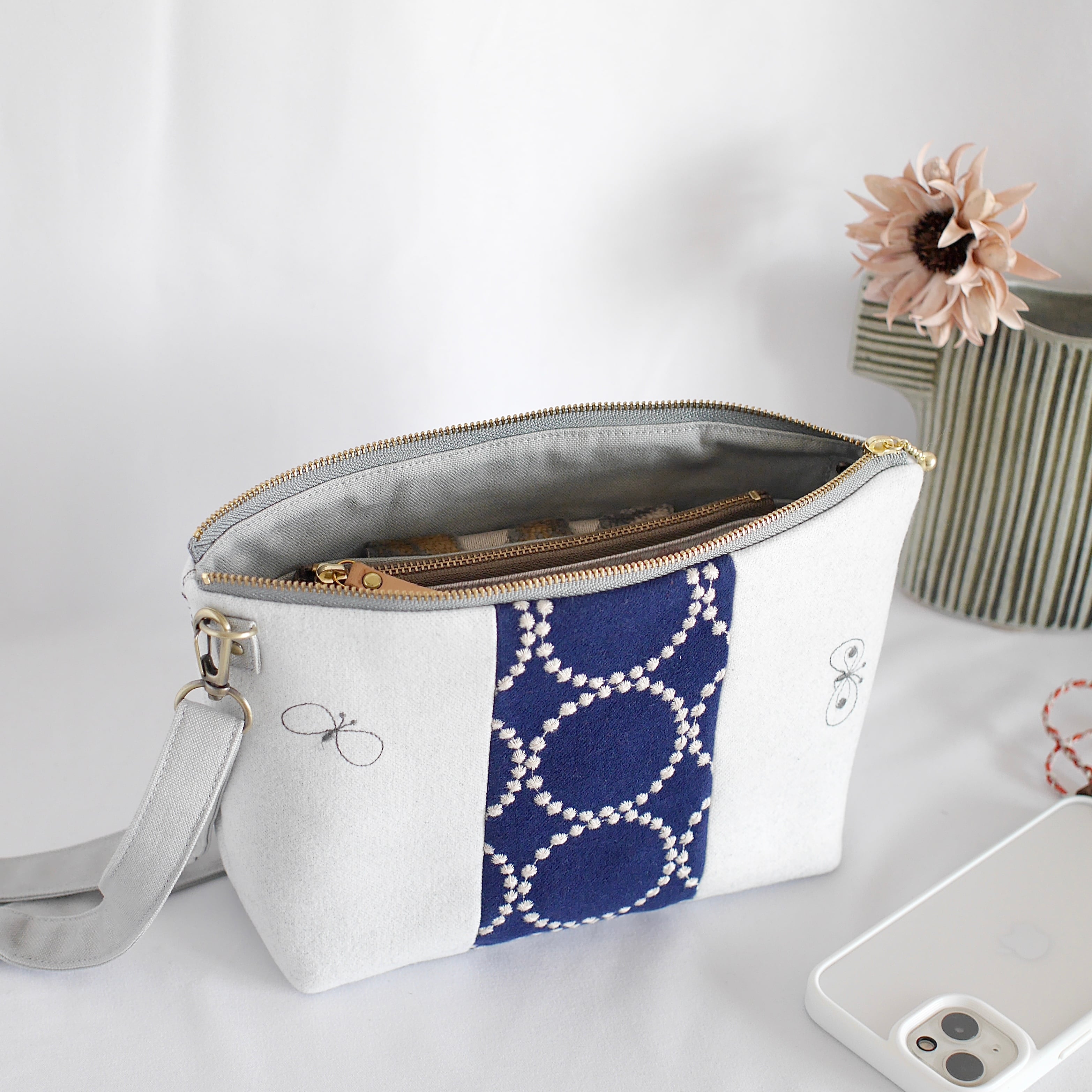 ホワイトのchouchoは裏側がブラックなので、ホワイトグレーのようなクールな色味です。それに合わせ、内布はライトグレーで配色しました。